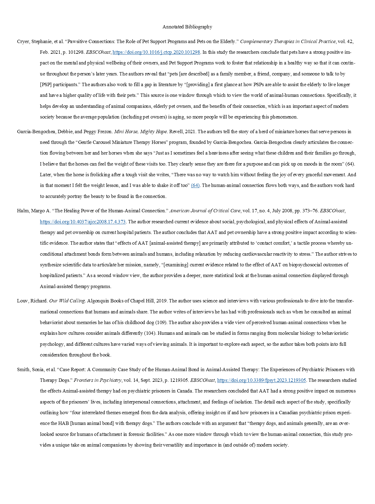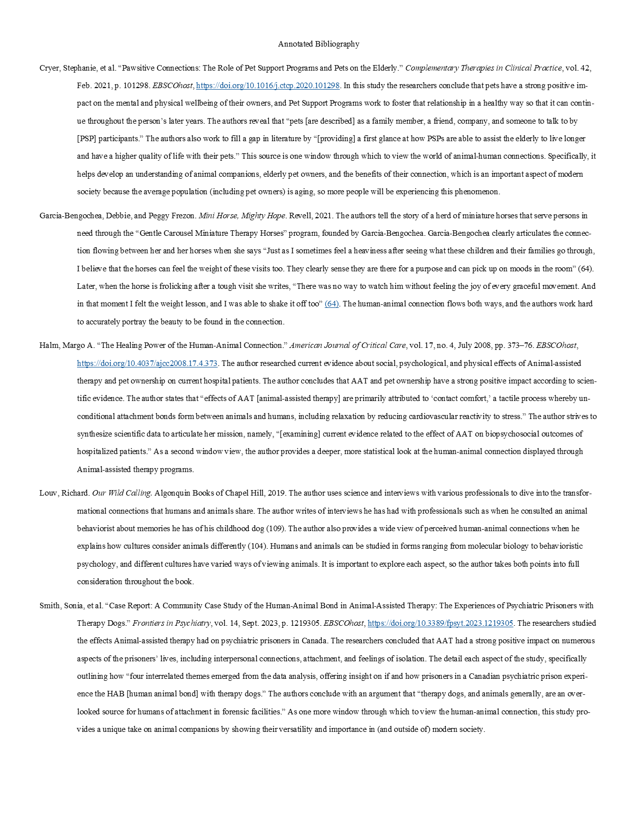 Annotated Bibliographies are wonderful tools for both the author and the reader. The author can take this chance to develop a deeper understanding of her topic, while the reader is given grater understanding about each source used in an article. Certain annotated bibliographies can even stand on their own by providing enough information to the reader about the subject. This annotated bibliography will serve to whet the readers appetite for the topic of the human-animal connection. My hope is that this can serve as a launch pad for the reader to take off and discover more on their own, pursuing their own research.