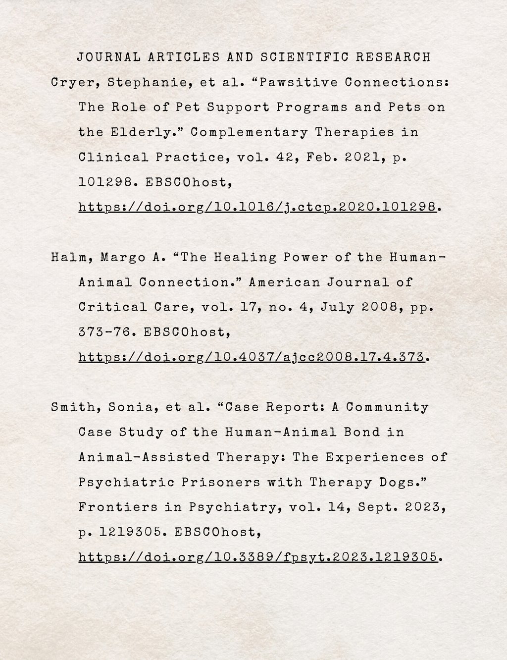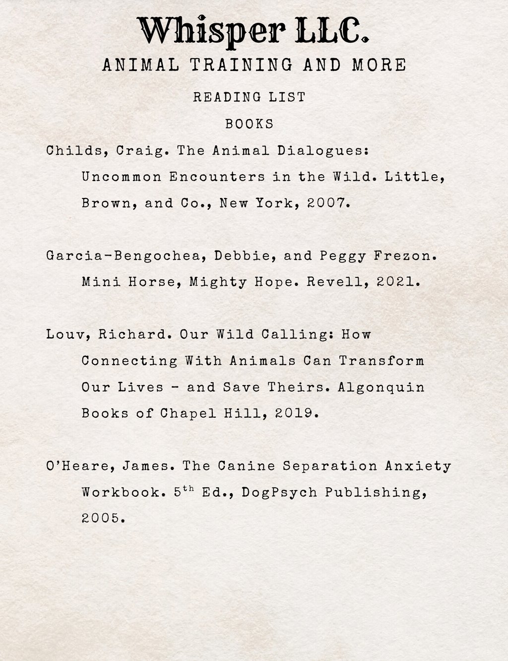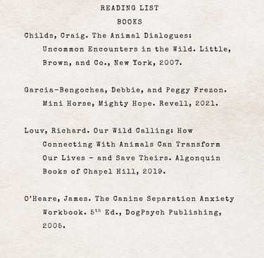 This is the second part of Project #4. Here, I provide my client with a list of books and articles to jumpstart his/her journey into discovering more about the human-animal connection. If this were a real blog post, I may format the listings differently, add pictures, and perhaps even links to purchase the books. This format here is simply how I would communicate the recommendations via letter. The beginning of the letter can be found in the "Contact Me" page.